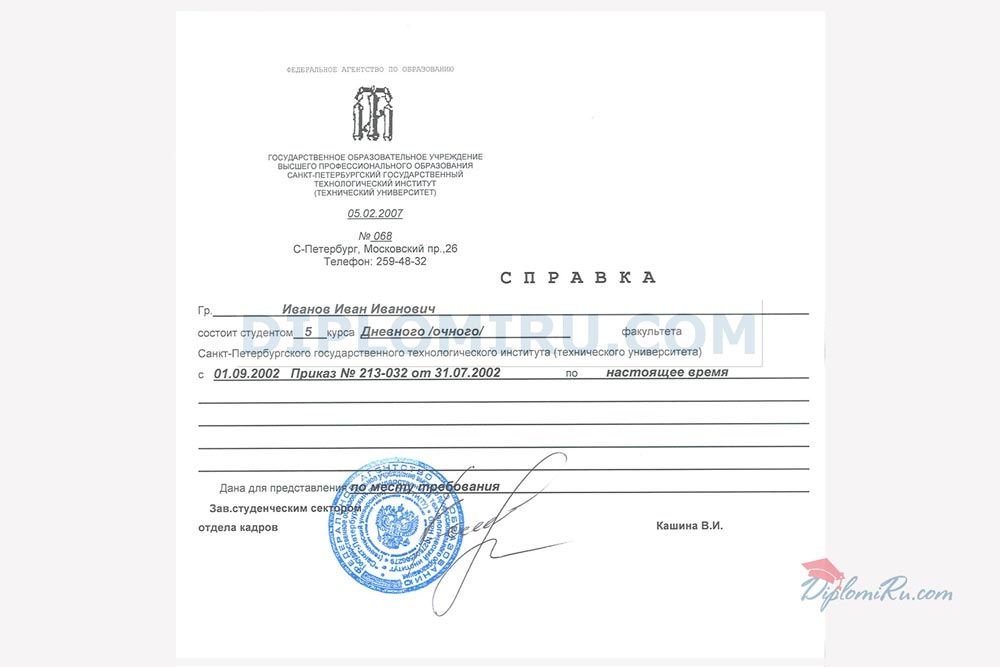На нашем сайте Вы можете купить справку об обучении в ВУЗе, техникуме или колледже, ПТУ, школе для предоставления по месту требования. Справка изготавливается на обыкновенной бумаге формата А4, заполняется по стандарту или по образцу реально выданных в том или ином учебном заведении справок. За долгие годы работы мы накопили огромное количество таких образцов и готовы сделать их точную копию, но с Вашими данными. Печати и подписи соответствуют оригиналам. ВНИМАНИЕ СКИДКИ! В комплекте с дипломом о высшем образовании дешевле. Скидка по 2000 рублей на каждый документ при покупке 2х и более позиций.Похожие товары