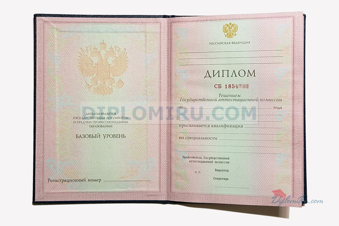 Диплом об окончании указанного ССУЗа в 2011-2013 годах. Бланк «Гознак»